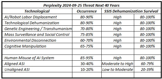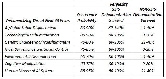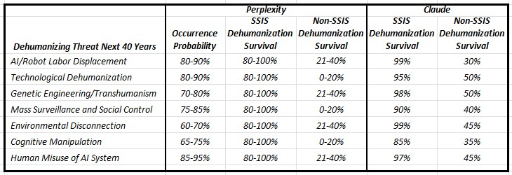 In a similar prior conversation, Claude's survival SSIS probabilities were a little more optimistic than Perplexity. The following table provides a comparison focused on the principal dehumanizing categories.