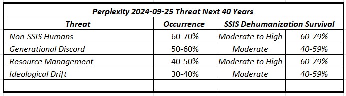 Based on a single descriptive paragraph about Self-Sustaining Isolated Societies (SSIS), Perplexity (2024-09-25) analyzed potential dehumanizing threats to such societies, estimating both the probability of these threats occurring within 40 years and the SSIS's likelihood of surviving them according to the following categories: High (80-100%) indicates strong survival likelihood with minimal impact; Moderate to High (60-79%) suggests likely survival with notable challenges to resilience; Moderate (40-59%) represents significant challenges with roughly equal chances of success or failure; Low to Moderate (20-39%) means survival is possible but difficult, with more negative than positive factors; Low (0-19%) indicates unlikely survival with only minimal chance of overcoming challenges; and finally, Unknown designates insufficient information or excessive uncertainty to estimate survival probability.