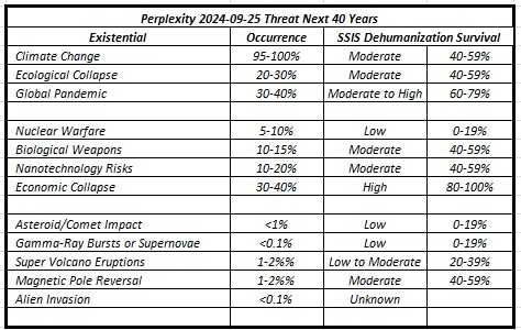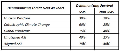 Claude also provided other dehumanization survival probabilities for potential physical existential threats for SSIS and non-SSIS populations which are presented in the following table: