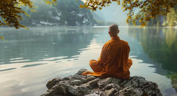 The meditating monk embodies the transcendence of the very drives that fuel superhuman development—the Western pursuits of conquest, accumulation, and technological domination.