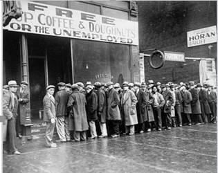Photo of unemployed people lined up outside a soup kitchen in Chicago, USA, during the Great Depression (1929-1939). Wikipedia: Great Depression retrieved 2024-09-16.
