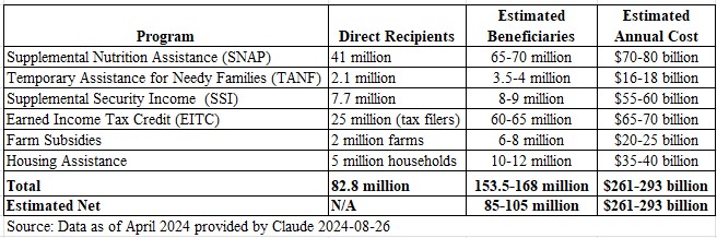 As of April 2024, the annual costs of US Federal assistance for an estimated 85-105 million beneficiaries were approximately $261-$293 billion dollars. The estimated number of beneficiaries represents about 24-30% of the U.S. population, which aligns with general estimates of the proportion of Americans receiving some form of government assistance. The annual costs per direct recipient for those programs was an estimated $3,100-$3,500.