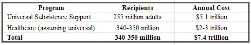 In broad strokes the costs of Federal assistance would increase from the current $0.3 trillion dollars to a Universal Subsistence Support of $7.4 trillion dollars and would cover nearly everyone in the US. Such a scenario would deny the government income tax revenues from individuals ($2.2 trillion 2023), payroll taxes ($1.6 trillion 2023) and fundamentally overwhelm the federal budget.